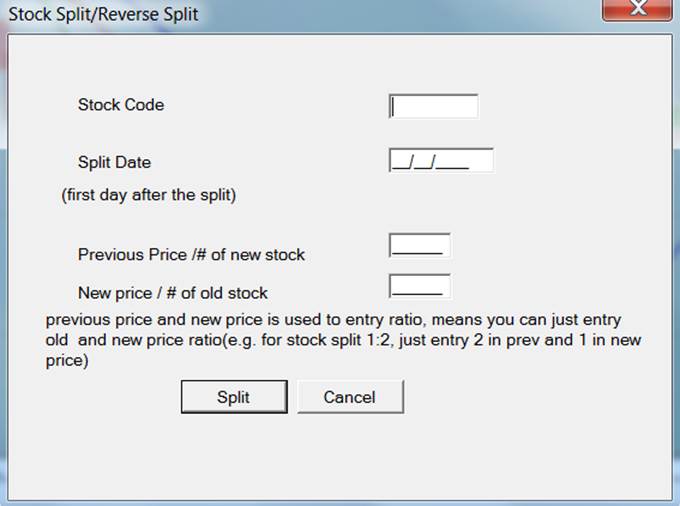 Digunakan untuk stock split ataupun reverse split, masukkan kode stok, tanggal split/reverse split (hari pertama mulai berlakunya split/reverse split), harga closing/jumlah stok baru, harga baru/jumlah stok baru.