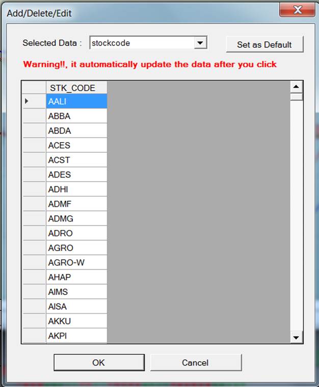 Untuk stockcode, defaultnya adalah semua kode yg ada, tapi anda bisa menghapus kode stok yg tidak diinginkan (expired, go private dll).